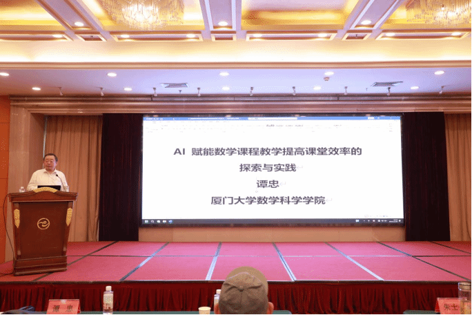 厦门大学谭忠教授在致辞中高度评价本次研讨会的举办意义。他表示,当前人工智能技术正深刻影响教育生态,此次会议为全省数学教育工作者搭建了宝贵的交流平台,恰逢其时、意义深远。他强调,面对新时代人才培养需求,高校应进一步加强数学基础课程教学改革,推动数学与前沿技术的交叉融合,不断提升数学教育育人成效。