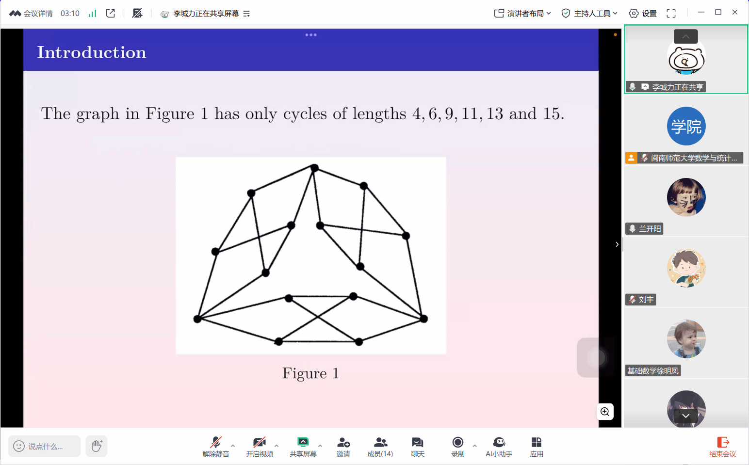 邀请,9月10日上午,华东师范大学李诚力博士在腾讯会议作了题为《Cycles of consecutive lengths in 3-connected graphs》的讲座。相关师生聆听了此次讲座,讲座由兰开阳老师主持。