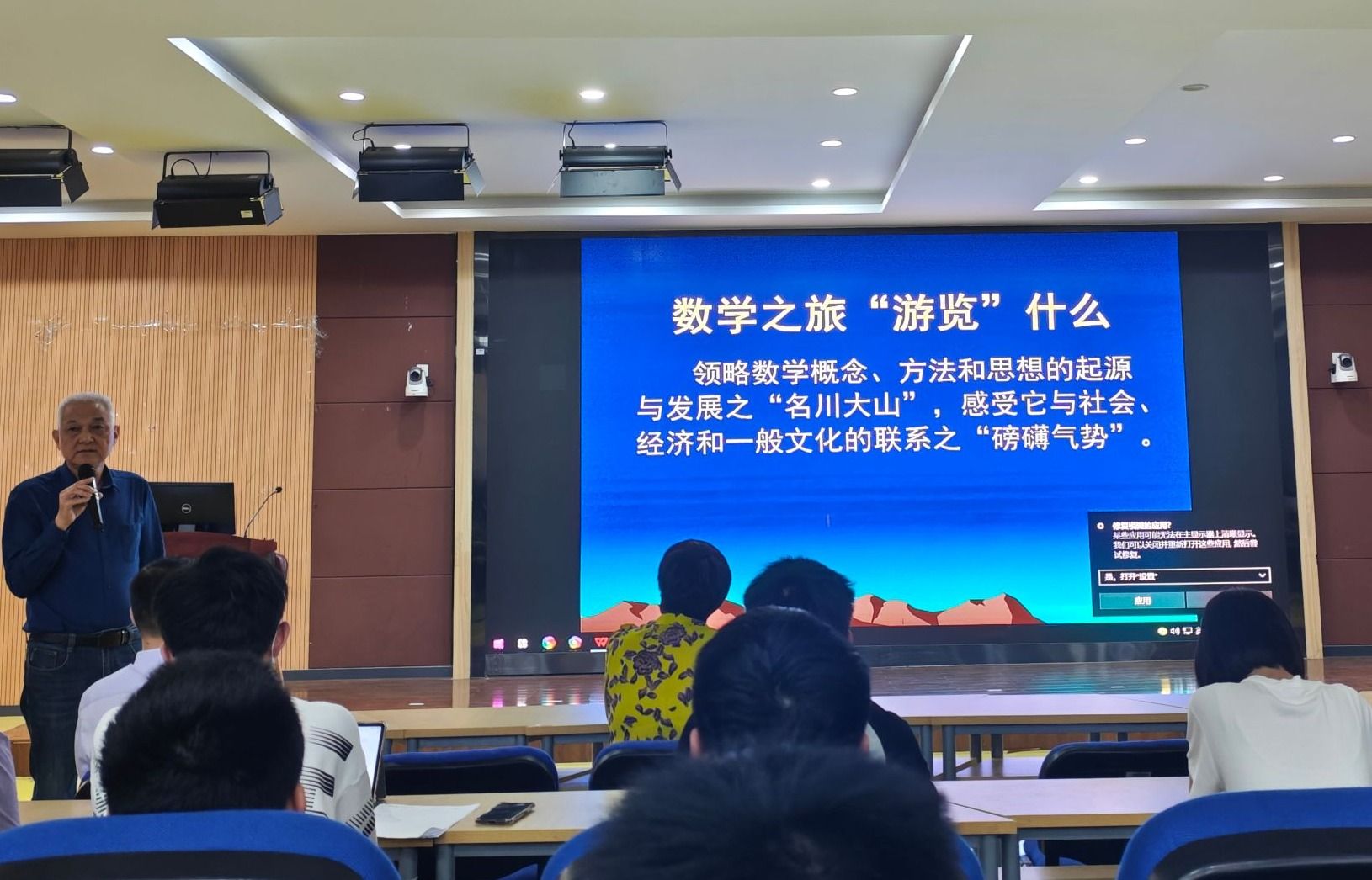 讲座中,林寿教授以数学史发展脉络为线索,围绕数学文化与数学思想传承展开系统分享,讲解深入浅出、脉络清晰,兼具学术深度与人文温度。他首先以《数学史概论》为依托,明确指出数学史是人类文明史的重要篇章,为整场讲座奠定了 “以史明思、以数育人” 的核心基调。随后,他以系统化的数学史专题框架,完整梳理了数学学科跨越千年的发展历程,详细讲解了数学的早期发展、古代希腊数学、秦至元朝的中国数学、中世纪印度与阿拉伯及欧洲数学、文艺复兴至牛顿时代与分析时代、19 世纪数学的革新发展、近 300 年的中国数学演进与 20 世纪数学概观等核心内容,清晰勾勒出数学学科从萌芽到蓬勃发展的完整图景。讲座过程中,林寿教授进一步阐释了本次 “数学之旅” 的核心内涵,带领在场师生领略数学概念、方法和思想的起源与发展之 “名川大山”,深刻感受数学与社会、经济和一般文化之间密不可分的磅礴联系。同时,他结合 2000 年世界数学年的设立宗旨,解读了 “让数学及其对世界的意义被社会所了解、被公众所了解” 的核心内涵,传递了数学科普与数学文化传播的重要价值,引导师生跳出公式与定理的框架,读懂数学背后的文明底蕴与科学精神。
