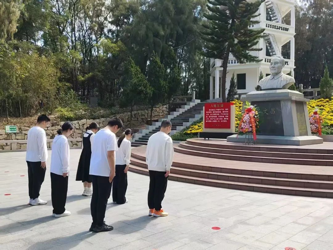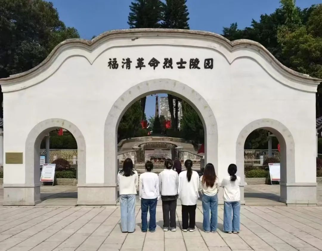 福清革命历史纪念碑前,庄严的碑身诉说着无数先烈的英勇事迹,实习生们默哀致敬,缅怀英勇牺牲的先烈们。