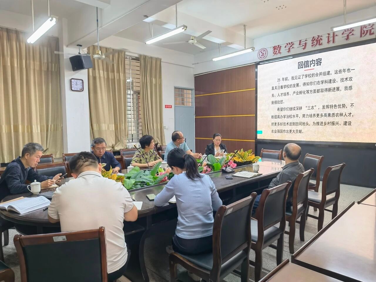 会议要求,一要广泛开展习近平总书记重要回信精神的学习研讨。把学习好、宣传好、贯彻好习近平总书记重要回信精神作为重要政治任务,组织宣讲宣传,开展专题学习研讨,组织师生热议。二要持续深化教育教学改革,着力解决重点难点问题,加强数学学科与其他学科的交叉融合,促进学院建设发展高质量提升。三要立足学院特色,找准理论与实践的结合点,科学谋划好学院“十五五”发展路径,推动数学成果转化应用,为实现高水平科技自立自强贡献数学智慧和力量。