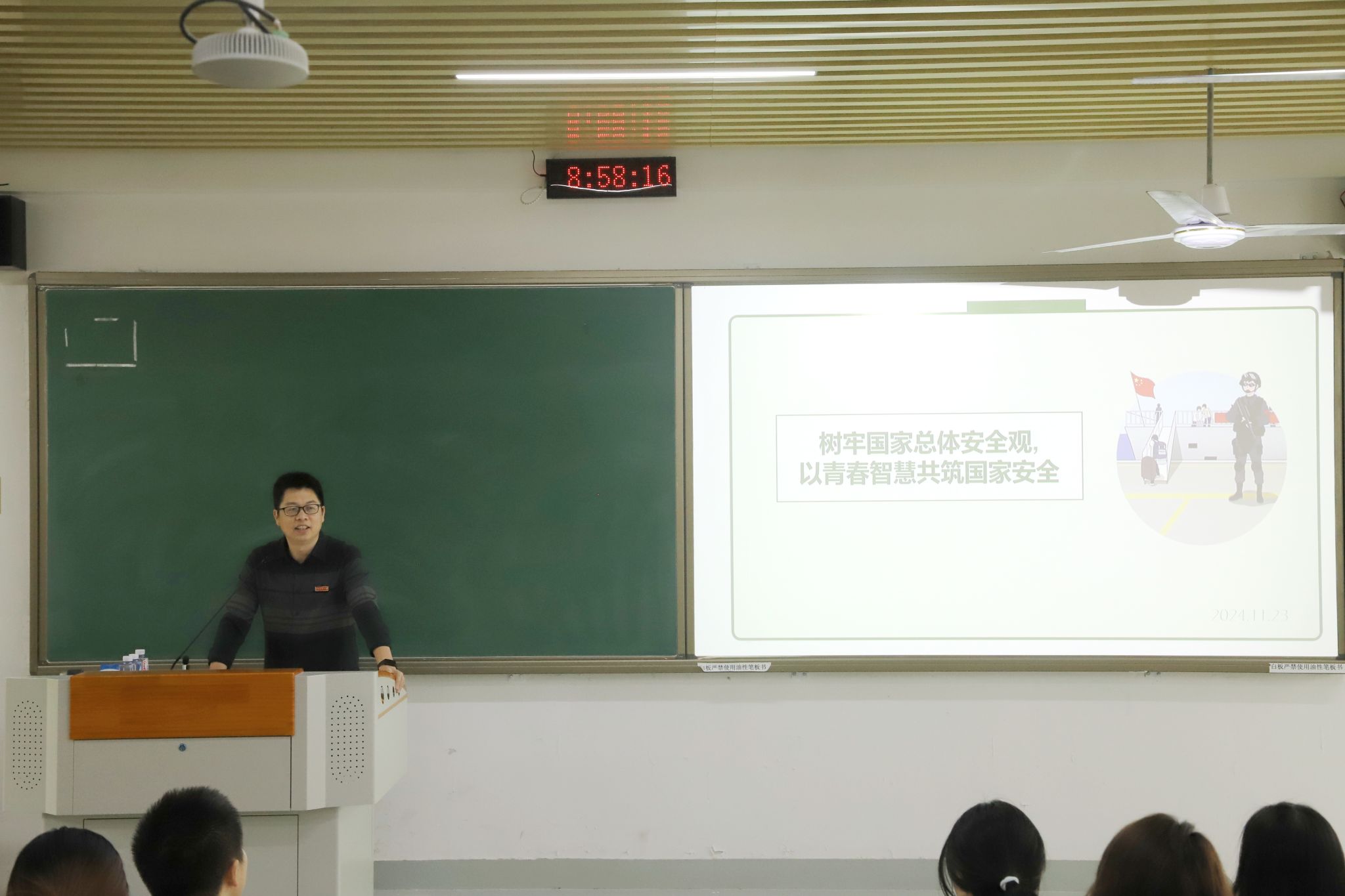11 月 23 日上午,学生处副处长陈明老师以 “国家安全与我们息息相关;坚持总体国家安全观;以青春智慧,做国家安全守护人” 为主题展开授课。陈明老师深入剖析了坚持总体国家安全观的重要性。他强调,同学们要时刻保持警惕,规避无意识的违法行为,一旦发现他人异常行为需及时举报,切实担当起国家的安全守护人。