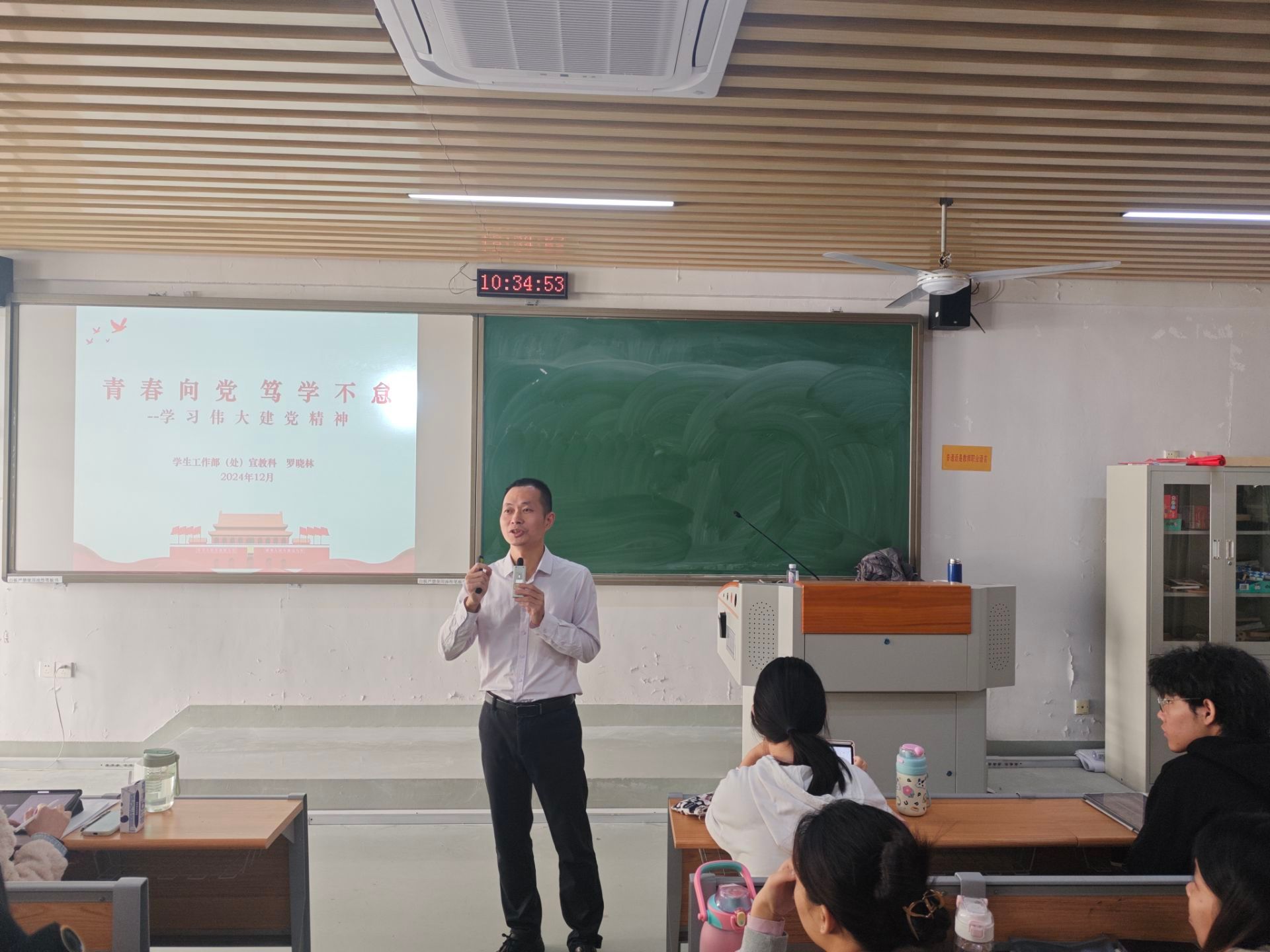 12 月 1 日上午,校学生处宣传教育科科长罗晓林老师带领同学们回顾了 “中国共产党的创立、新民主主义革命时期、社会主义革命和建设时期、改革开放和社会主义现代化建设新时期、中国特色社会主义进入新时代” 等不同阶段的建党精神。罗晓林老师指出,党的领导是伟大建党精神的 “政治灵魂”,生动的讲述让学员们坚定了传承和发扬伟大建党精神的决心,激励大家在未来工作中砥砺奋进。