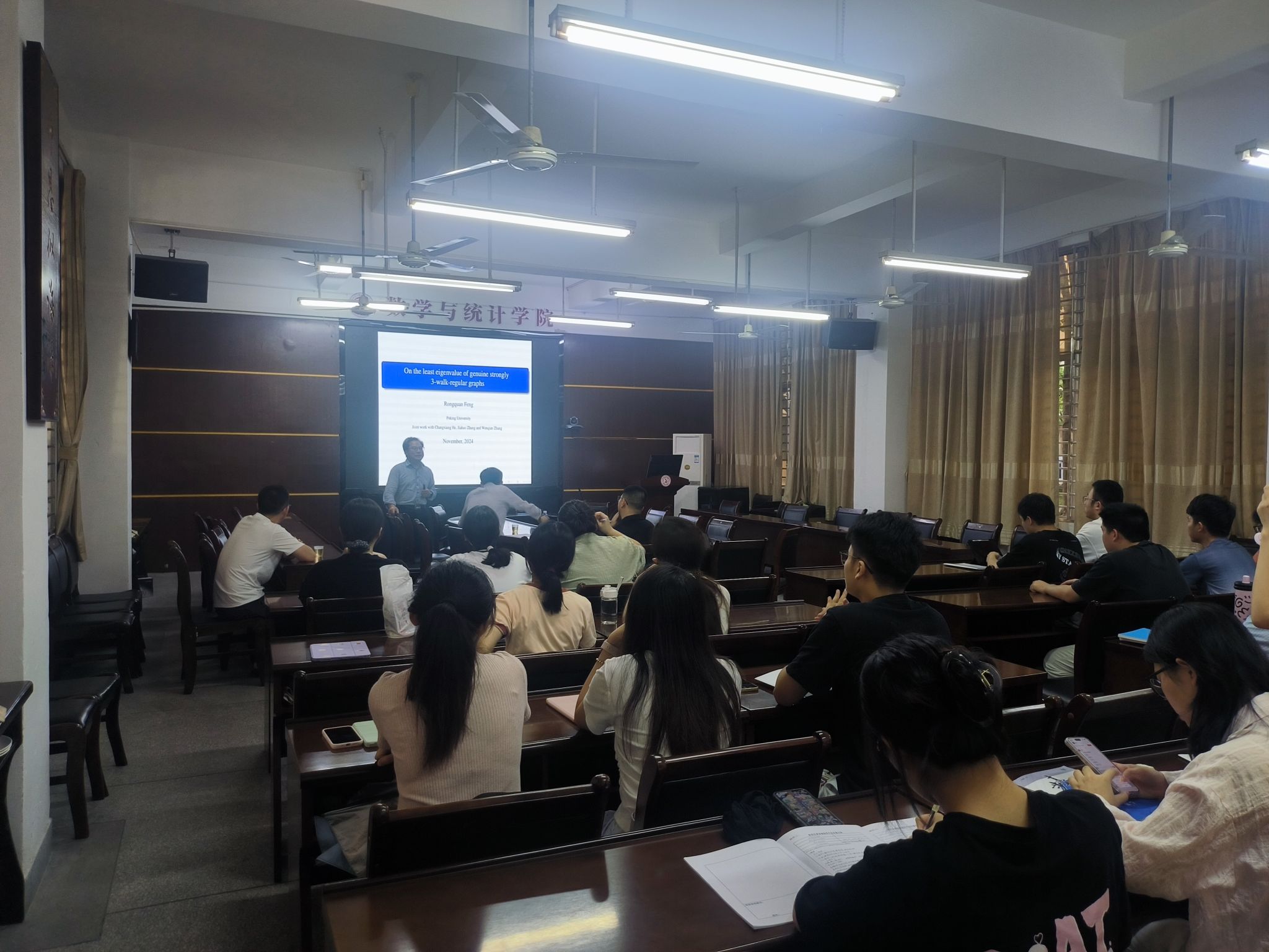 邀请,11月1日下午,北京大学冯荣权教授在砺志楼114作了题为《On the least eigenvalue of genuine strongly 3-walk-regular graphs》的报告。相关师生聆听了此次报告,报告由卢福良老师主持。