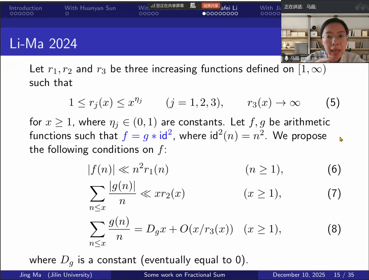 邀请,12月10日上午,吉林大学马晶教授在线上作了题为《Fractional sums of arithmetic functions》的讲座。相关师生聆听了此次讲座,讲座由冯真真老师主持。