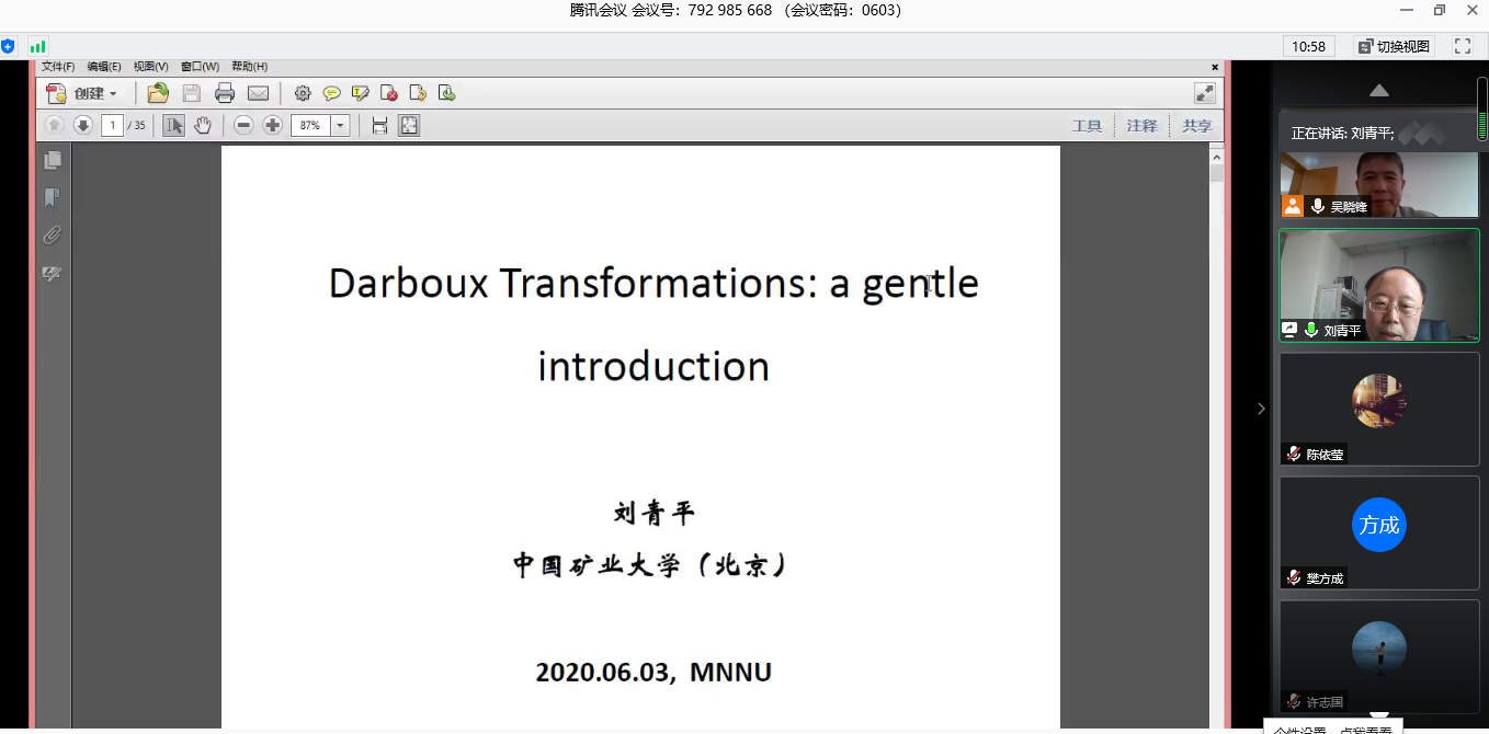 邀请,6月3日上午,中国矿业大学(北京)刘青平教授在腾讯会议作了题为《Darboux transformations——a gentle introduction》的报告。相关师生聆听了此次报告,报告由吴晓峰教授主持。