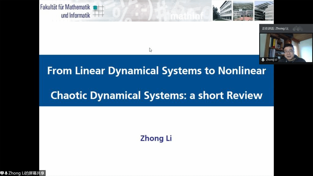 邀请,12月17日下午,德国哈根大学李忠教授在腾讯会议作了题为《From Linear Dynamical Systems to Nonlinear Chaotic Dynamical Systems: a short Review》的报告。相关师生聆听了此次报告,报告由吴晓锋教授主持。