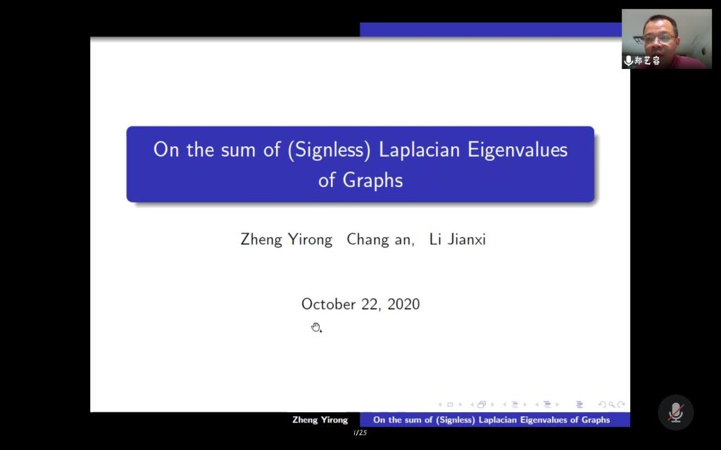 邀请,10月22日下午,厦门理工学院郑艺容副教授在腾讯会议作了题为《On the sum of (signless) Laplacian eigenvalues of graphs》的报告。相关师生聆听了此次报告,报告由卢福良教授主持。