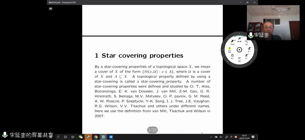 邀请,12月20日上午,南京师范大学宋延奎教授在腾讯会议作了题为《On star covering properties》的报告。相关师生聆听了此次报告,报告由林福财教授主持。