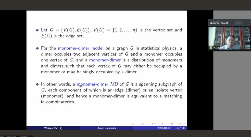 邀请,10月28日下午,集美大学晏卫根教授在腾讯会议作了题为《Using edge generating function to solve monomer-dimer problem》的报告。相关师生聆听了此次报告,报告由卢福良教授主持。