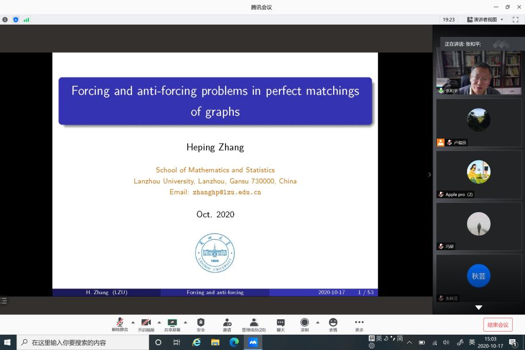 邀请,10月17日下午,兰州大学张和平教授在腾讯会议作了题为《Forcing and anti-forcing problems in perfect matchingsof graphs》的报告。相关师生聆听了此次报告,报告由卢福良教授主持。