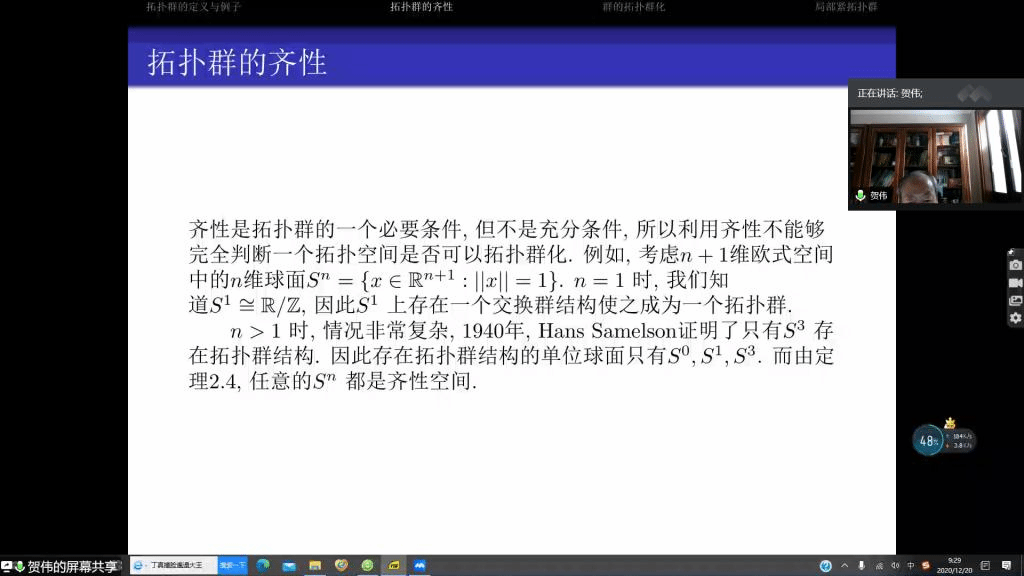 邀请,12月20日上午,南京师范大学贺伟教授在腾讯会议作了题为《谈谈拓扑群》的报告。相关师生聆听了此次报告,报告由林福财教授主持。