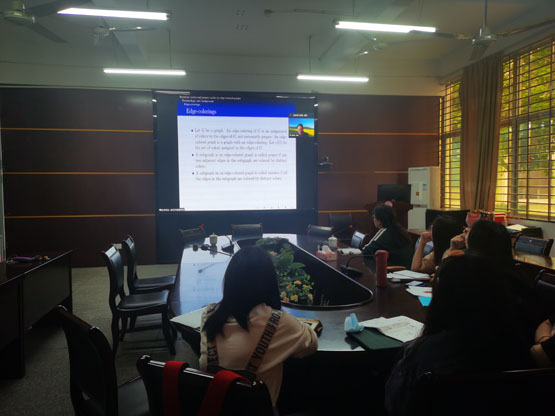 报告中,李学良教授首先介绍了边着色、点着色,彩虹圈、正常圈的相关概念,接着具体分析了彩虹圈,正常圈的两个研究方向的具体内容,然后分别介绍了完全图与非完全图的关于彩虹圈的现阶段研究成果。报告结束后,在座的师生就相关研究问题进行了探讨和交流。