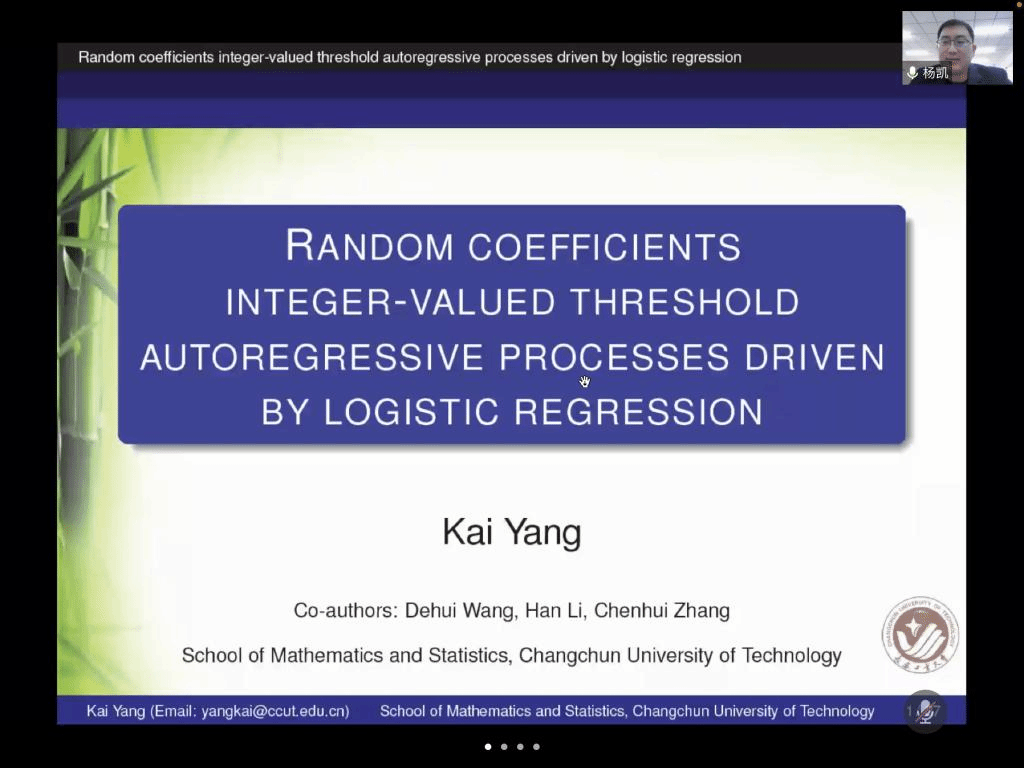 邀请,4月23日下午,长春工业大学杨凯博士在腾讯会议上作了题为《Random coefficients integer-valued threshold autoregressive processes driven by logistic regression》的报告。相关师生聆听了此次报告,报告由刘群副教授主持。