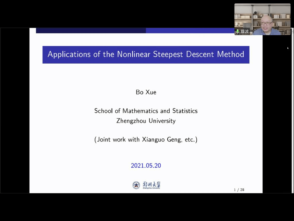 邀请,5月20日晚上,郑州大学薛波教授在腾讯会议作了题为《Applications of the steepest descent method to long-time asymptotics》的报告。相关师生在砺志楼114聆听了此次报告,报告由樊方成副教授主持。