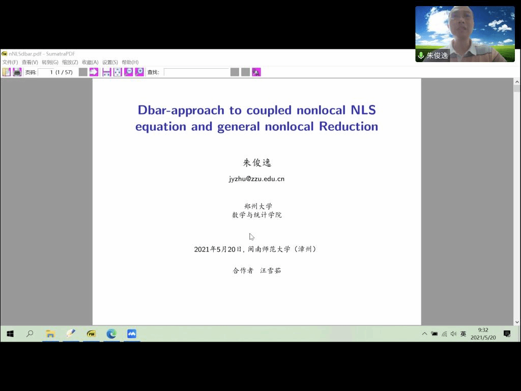 邀请,5月20日下午,郑州大学朱俊逸教授在腾讯会议作了题为《耦合非局域NLS方程的Dbar方法研究及一般非局域约化》的报告。相关师生在砺志楼114聆听了此次报告,报告由樊方成副教授主持。