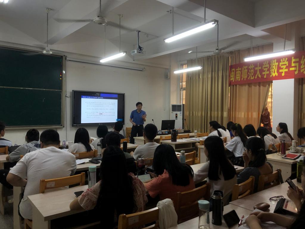 邀请,5月23日晚上,湖州师范学院胡璋剑教授在砺志楼105作了题为《HANKEL OPERATORS ON STRONGLY PSEUDOCONVEX DOMAINS》的报告。相关师生聆听了此次报告,报告由李进金老师主持。