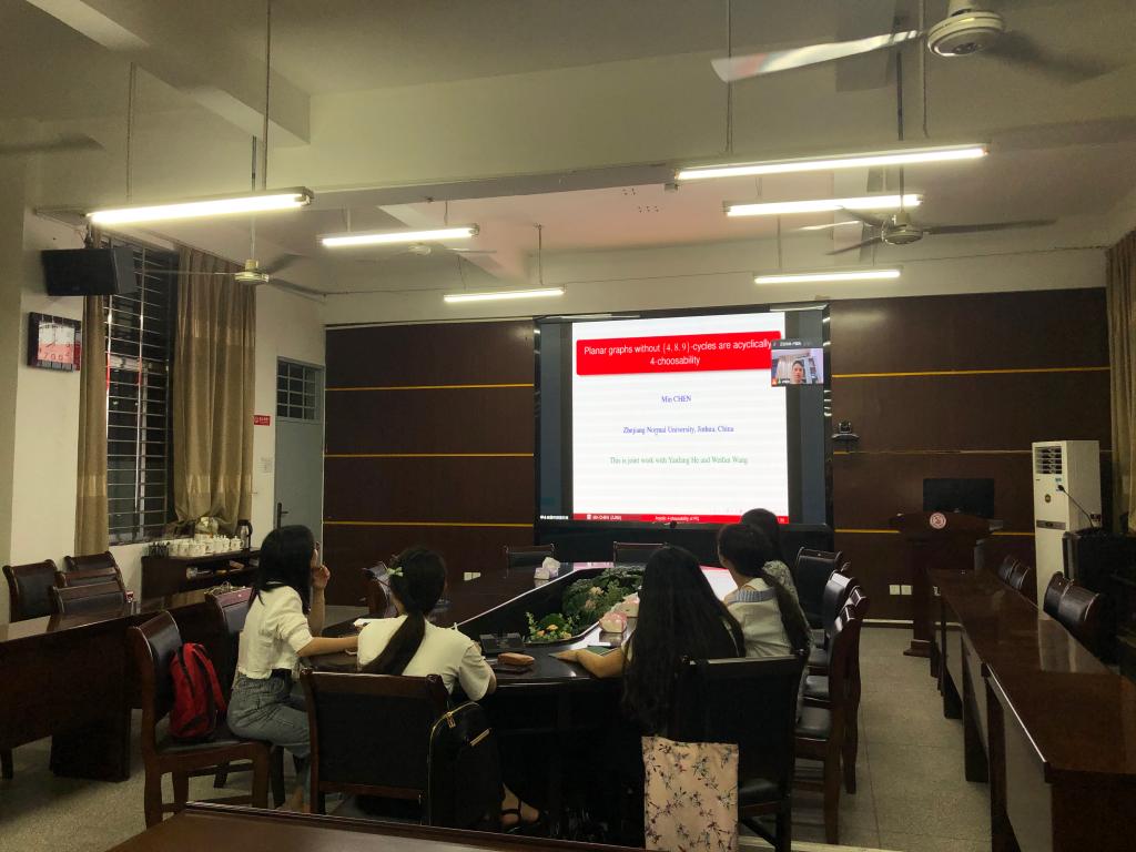 邀请,6月3日晚上,浙江师范大学陈敏教授在腾讯会议作了题为《Planar graphs without $\{4,8,9\}$-cycles are acyclically 4-choosability》的报告。相关师生聆听了此次报告,报告由卢福良教授主持。