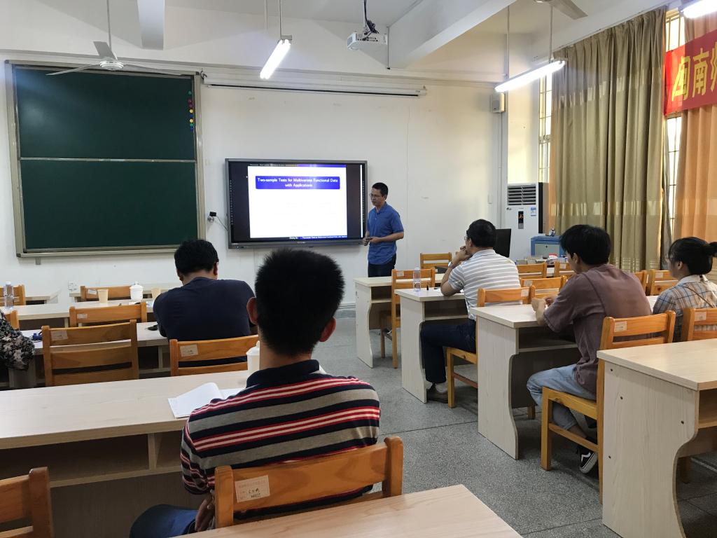 邀请,6月4日上午,华侨大学邱志平教授在砺志楼105作了题为《Two-sample Tests for Multivariate Functional Data with Applications》的报告。相关师生聆听了此次报告,报告由施建华教授主持。