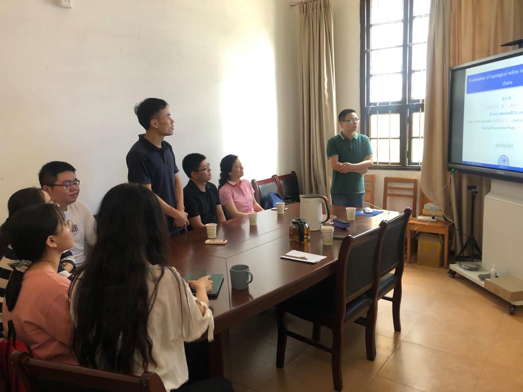 邀请,6月4日早上,闽江学院魏首柳教授在八号楼105作了题为《Enumeration of topological indices in random polygonal chains》的报告。相关师生聆听了此次报告,报告由卢福良教授主持。