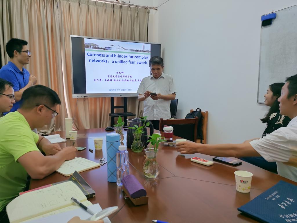 邀请,6月5日晚上,华侨大学汤龙坤教授在八号楼404作了题为《复杂网络的Coreness和h-index:一个统一的框架》的报告。相关师生聆听了此次报告,报告由吴晓锋教授主持。
