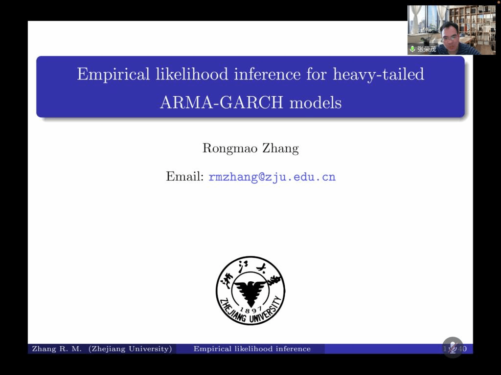 邀请,6月29日早上,浙江大学张荣茂教授在腾讯会议上作了主题为《Empirical likelihood inference for heavy-tailed ARMA-GARCH models》的报告。报告由施建华教授主持,相关师生聆听了此次报告。