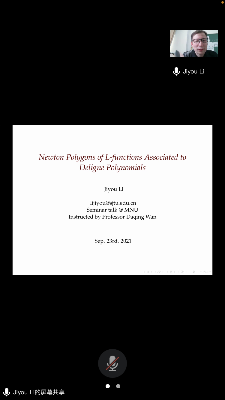 邀请,9月23日上午,上海交通大学李吉有教授在腾讯会议作了题为《Newton Polygons of L-functions Associated to Deligne Polynomials》的报告。相关师生聆听了此次报告,报告由曹炜教授主持。
