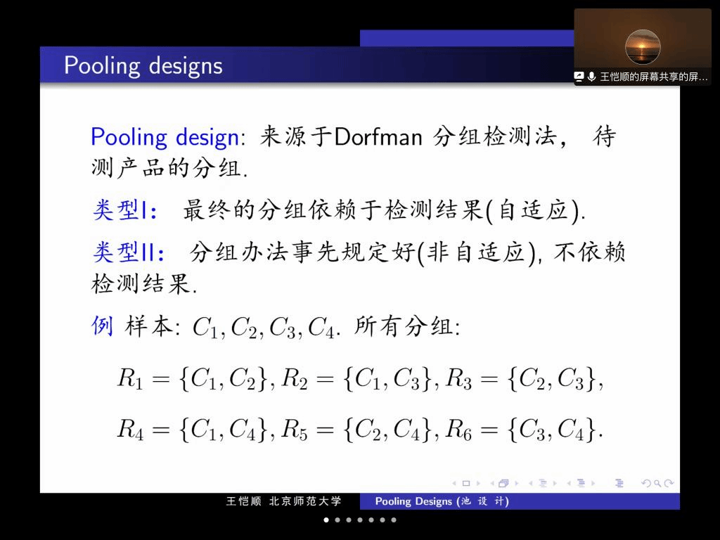 报告中,王恺顺教授利用二战时期的抽血体检,介绍了逐一检测法,由此引出了poolingdesigns的定义:来源于Dorfman分组检测法,待测产品的分组。之后向我展示了poolingdesigns在血液检测、化学泄漏检测、编码、DNA筛查和核酸检测上的应用。报告结束后,在座的师生就相关研究问题进行了探讨和交流。