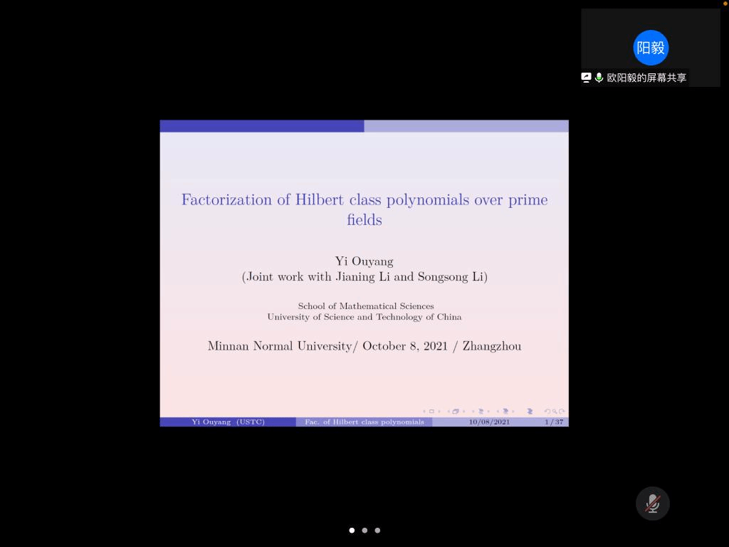 邀请,10月8日下午,中国科学技术大学欧阳毅教授在腾讯会议作了题为《Factorization of Hilbert class polynomials over prime fields》的报告。相关师生聆听了此次报告,报告由曹炜教授主持。