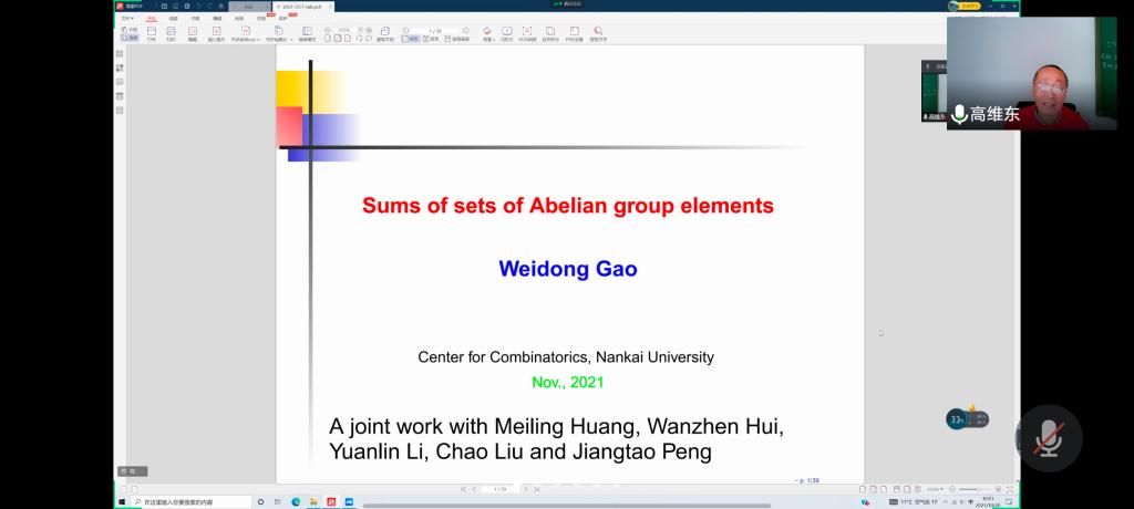 邀请,10月20日上午,天津大学高维东教授在腾讯会议作了题为《SUMS OF SETS OF ABELIAN GROUP ELEMENTS》的报告。相关师生聆听了此次报告,报告由曹炜教授主持。