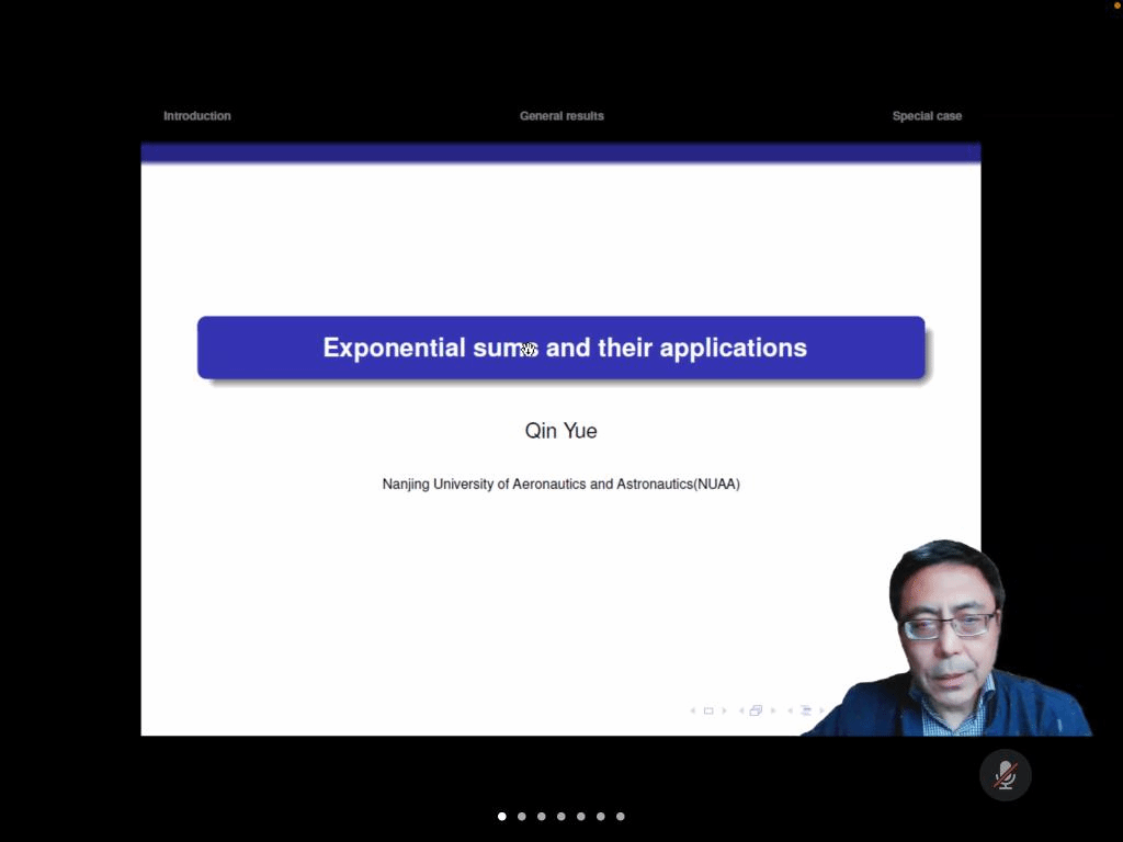 邀请,10月31日下午,南京航空航天大学岳勤教授在腾讯会议作了题为《Exponential sums and their applications》的报告。相关师生聆听了此次报告,报告由曹炜教授主持。