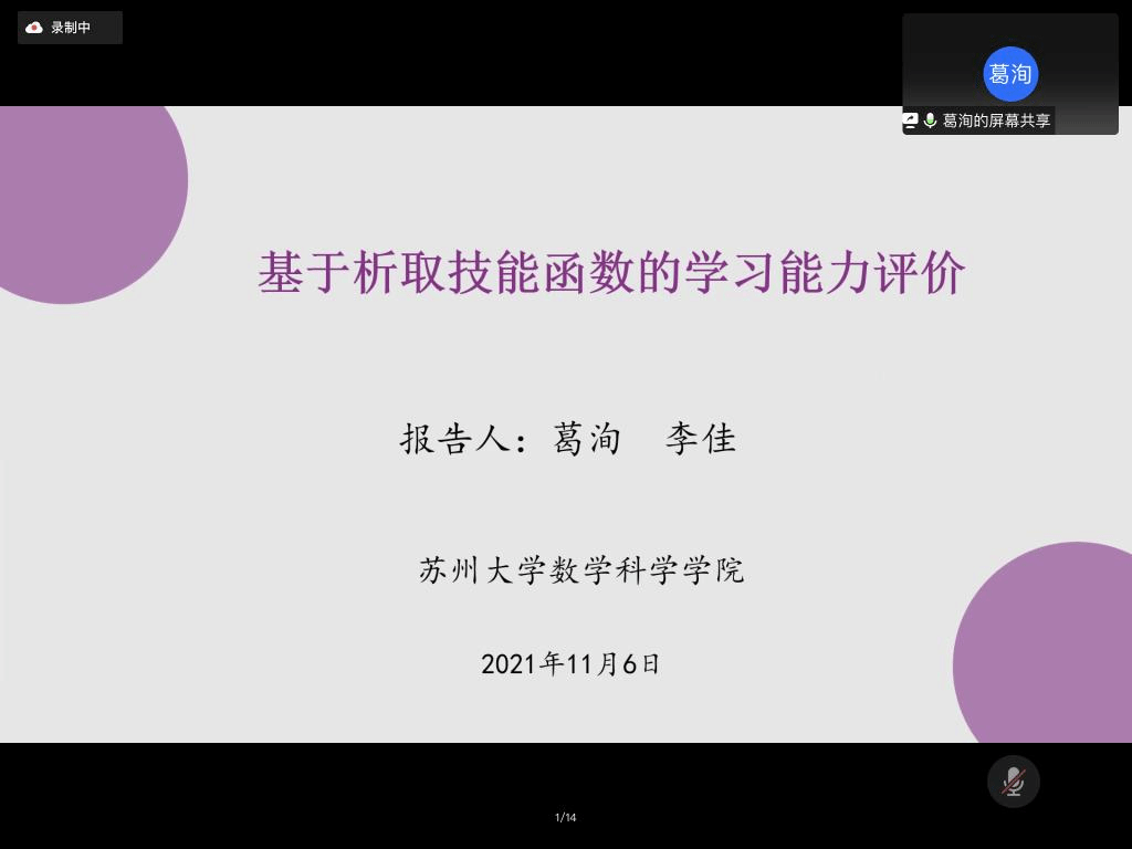 邀请,11月6日上午,苏州大学葛洵博士在腾讯会议作了题为《基于析取技能映射的学习能力评价》的报告。相关师生聆听了此次报告,报告由李进金教授主持。