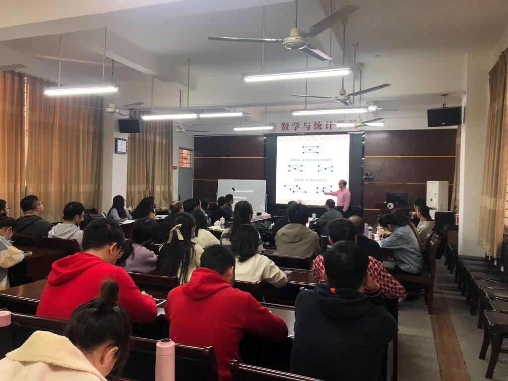 报告中,范更华教授首先介绍了关于图G=(V(G),E(G))的基本概念—匹配和覆盖,匹配是指E的一个子集M,M中的任意边在G中都不相邻;覆盖是指顶点集V的一个子集K,使得图G的每条边都至少有一个端点在K之中。接着范更华教授从四色问题引入,再到中国邮递员问题,向我们介绍了关于匹配覆盖的发展进程,然后介绍通过一些特殊的子图例如路,圈对图进行覆盖的问题,之后将问题聚焦在关于连通图上的Gallai's Conjecture。报告结束后,在座的师生就相关研究问题进行了探讨和交流。