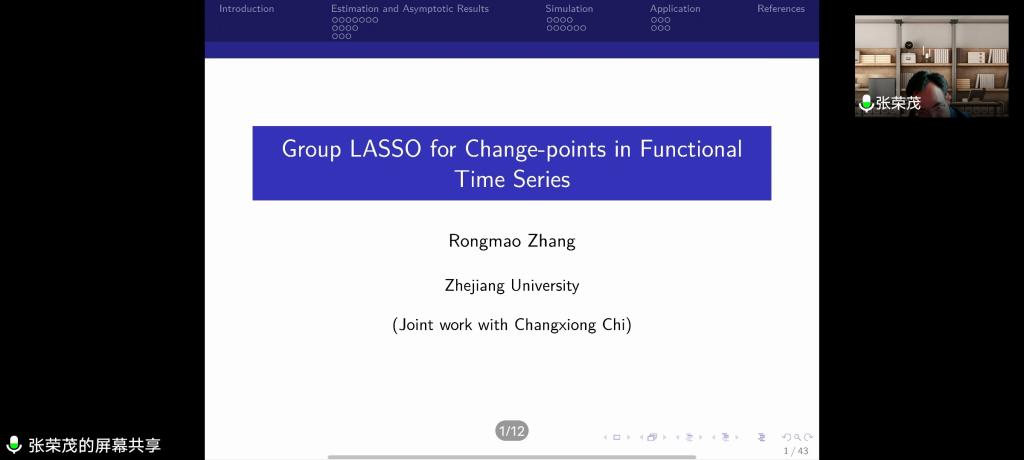 邀请,12月8日上午,浙江大学张荣茂教授在腾讯会议作了题为《Group LASSO of Change-points in Functional Time Series》的报告。相关师生聆听了此次报告,报告由吕阳阳博士主持。