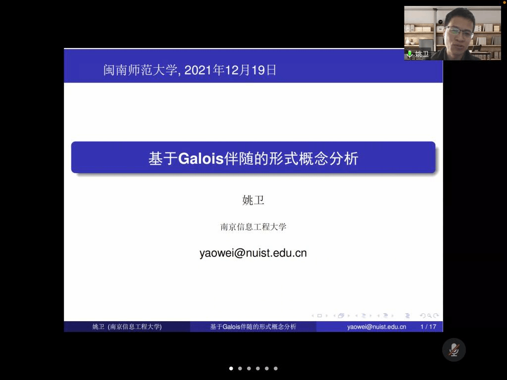邀请,12月19日下午,南京信息工程大学姚卫教授在腾讯会议作了题为《基于Galois伴随的形式概念分析》的报告。相关师生聆听了此次报告,报告由李进金老师主持。