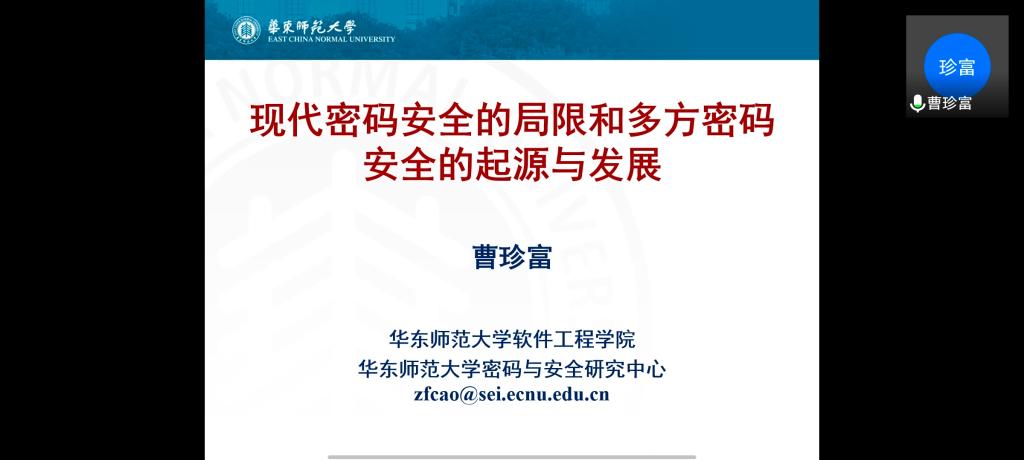 邀请,12月22日上午,华东师范大学曹珍富教授在腾讯会议作了题为《现代密码安全的局限和多方密码安全的起源与发展》的报告。相关师生聆听了此次报告,报告由曹炜教授主持。