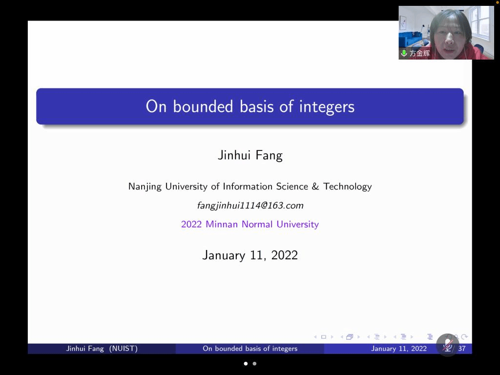邀请,1月11日下午,南京信息工程大学方金辉教授在腾讯会议作了题为《On bounded basis of integers》的报告。相关师生聆听了此次报告,报告由曹炜教授主持。