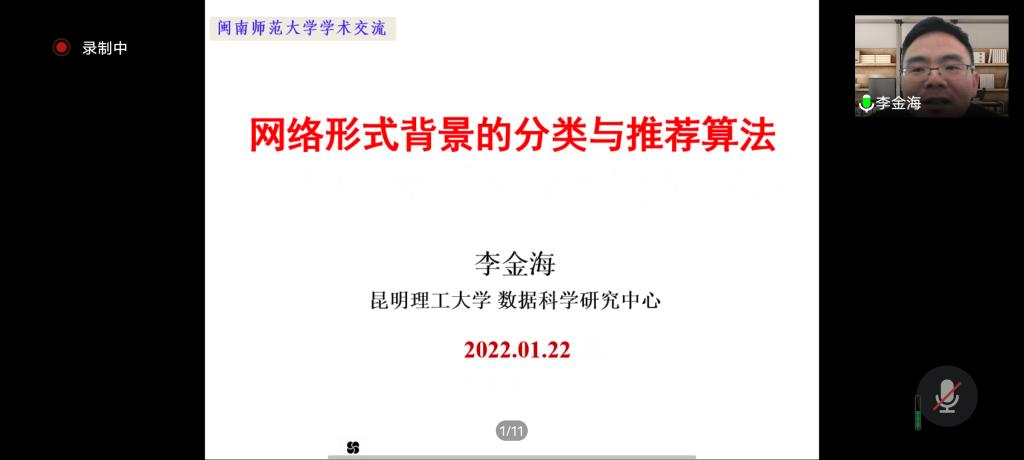 邀请,1月22日上午,昆明理工大学李金海教授在腾讯会议作了题为《网络形式背景的分类与推荐算法》的报告。相关师生聆听了此次报告,报告由李进金教授主持。