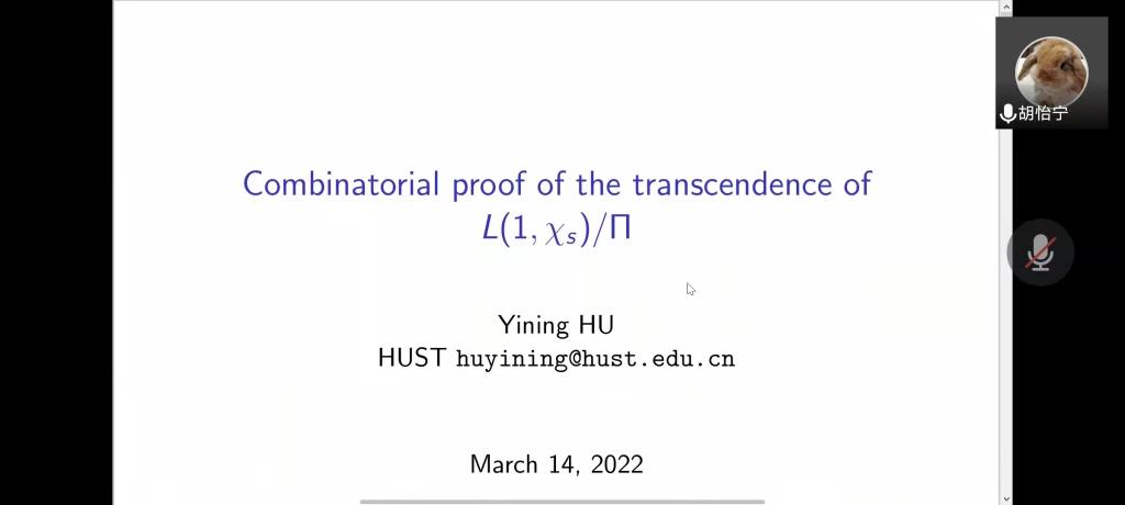 邀请,3月14日下午,华中科技大学胡怡宁副教授在腾讯会议作了题为《Transcendence, Carlitz L function, and Automata》的报告。相关师生聆听了此次报告,报告由曹炜老师主持。