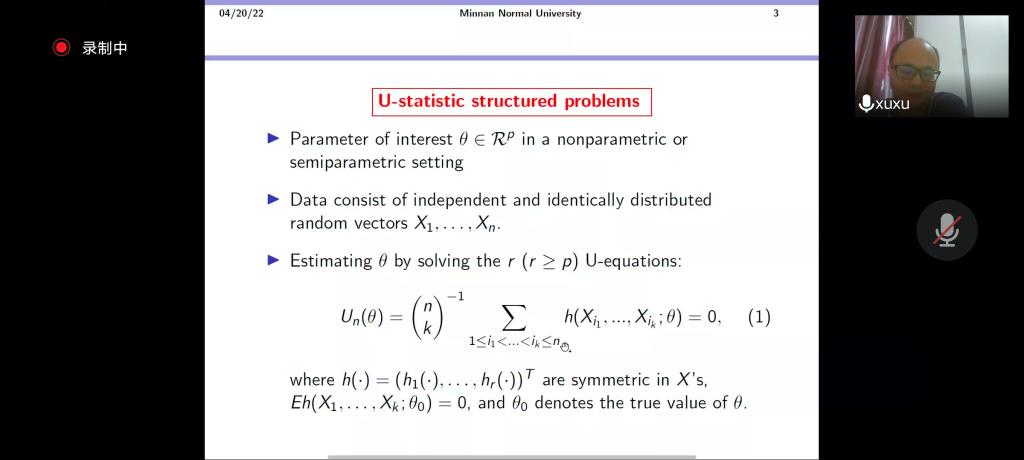 邀请,4月20日下午,香港大学徐锦峰教授在腾讯会议作了题为《On penalized jackknife empirical likelihood with a diverging number of U estimating equations》的报告。相关师生聆听了此次报告,报告由施建华老师主持。