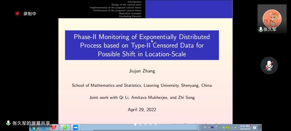邀请,4月29日晚上,辽宁大学统计学院张久军教授在腾讯会议作了题为《Phase-II Monitoring of exponentially distributed process based on type-II censored data for possible shift in location-scale》的报告。相关师生聆听了此次报告,报告由施建华老师主持。