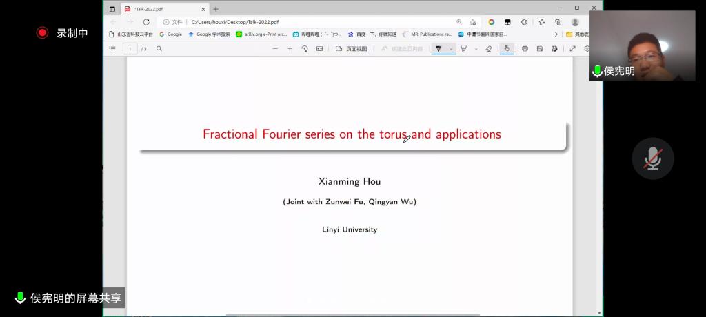 邀请,5月14日晚上,临沂大学侯宪明博士在腾讯会议作了题为《Fractional Fourier series on the torus and application》的报告。相关师生聆听了此次报告,报告由温泳铭老师主持。
