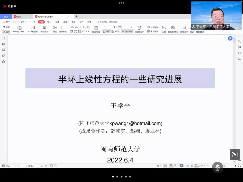 邀请,6月4日上午,四川师范大学王学平教授在腾讯会议作了题为《半环上线性方程的一些研究进展》的报告。相关师生聆听了此次报告,报告由黄韩亮老师主持。