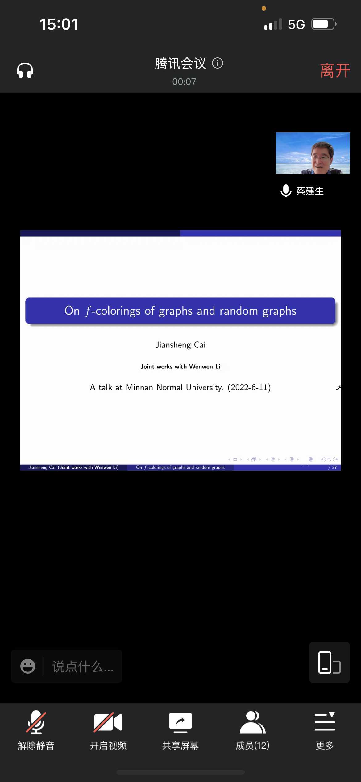 邀请,6月11日下午,潍坊学院蔡建生教授在腾讯会议作了题为《On f-colorings of graphs and random graphs》的报告。相关师生聆听了此次报告,报告由卢福良老师主持。