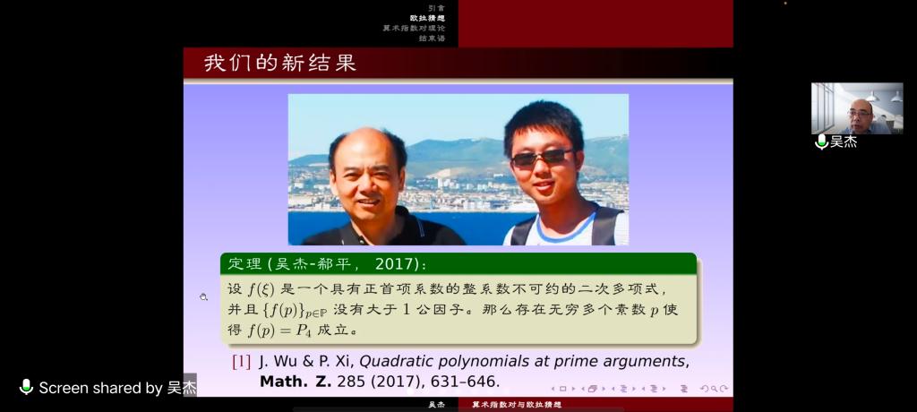 邀请,8月4日早上,法国国家科学研究中心(CNRS)特级研究员吴杰在腾讯会议作了题为《算术指数对与欧拉猜想》的报告。相关师生聆听了此次报告,报告由曹炜老师主持。