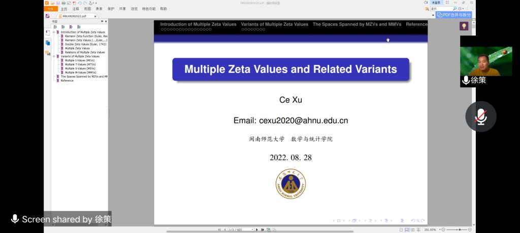 邀请,8月28日下午,安徽师范大学徐策副教授在腾讯会议作了题为《Multiple Zeta Values and Related Variants》的报告。相关师生聆听了此次报告,报告由曹炜老师主持。
