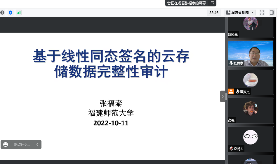 邀请,10月11日下午,福建师范大学张福泰教授在腾讯会议作了题为《基于线性同态签名的云存储数据完整性审计》的报告。相关师生聆听了此次报告,报告由黄振杰老师主持。