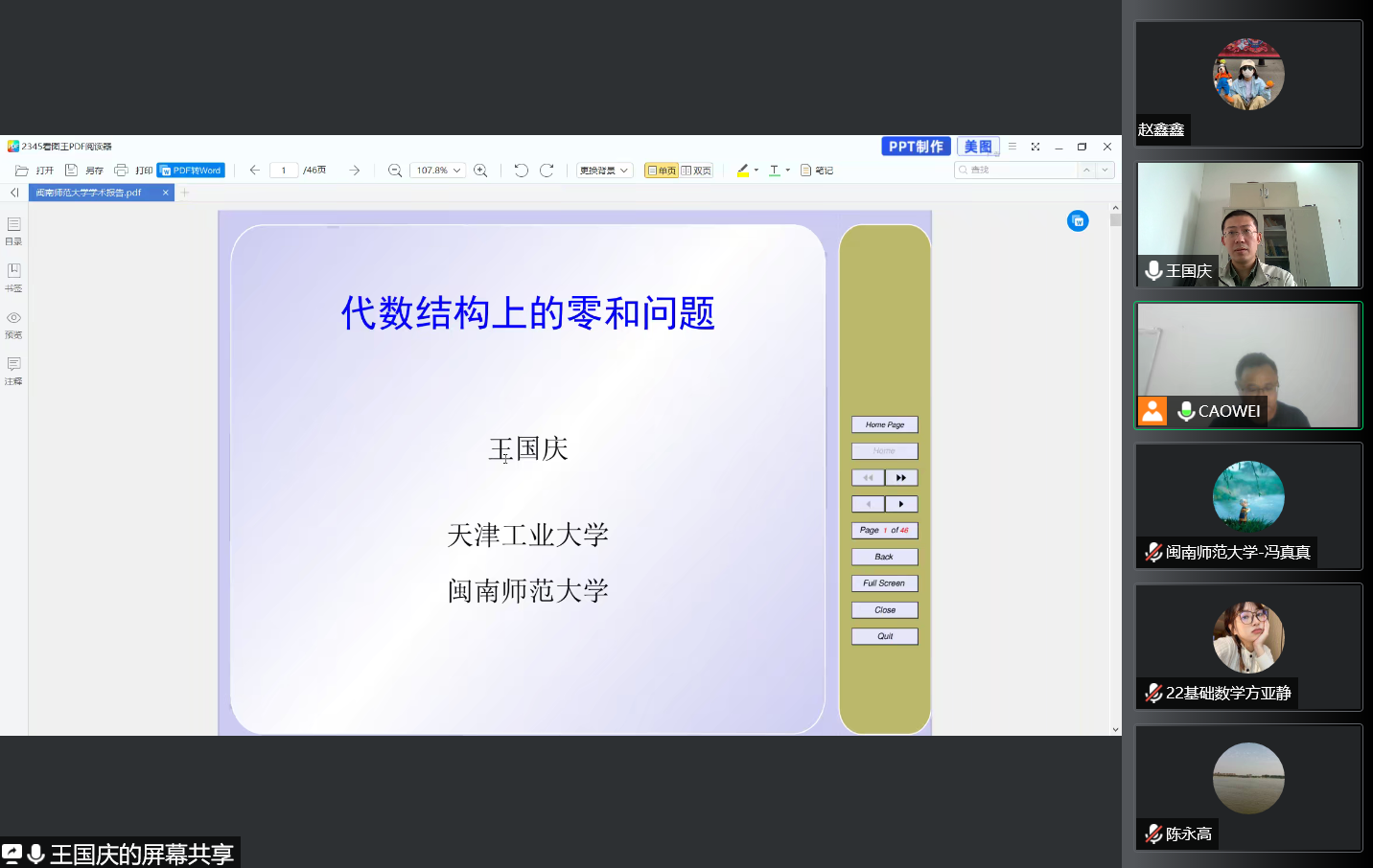 邀请,10月14日下午,天津工业大学数学科学学院王国庆教授在腾讯会议作了题为《代数结构上的零和问题》的报告。相关师生聆听了此次报告,报告由曹炜老师主持。