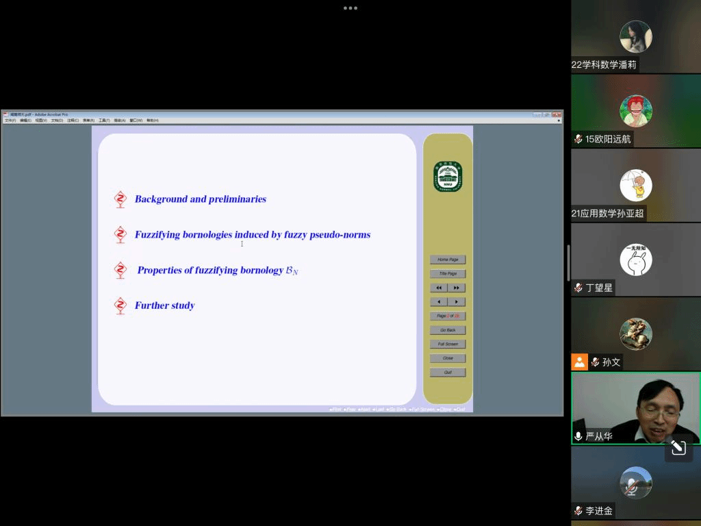 邀请,10月25日下午,南京师范大学严从华教授在腾讯会议作了题为《Fuzzifying bornologies induced by fuzzy pseudo-norms》的报告。相关师生聆听了此次报告,报告由孙文老师主持。
