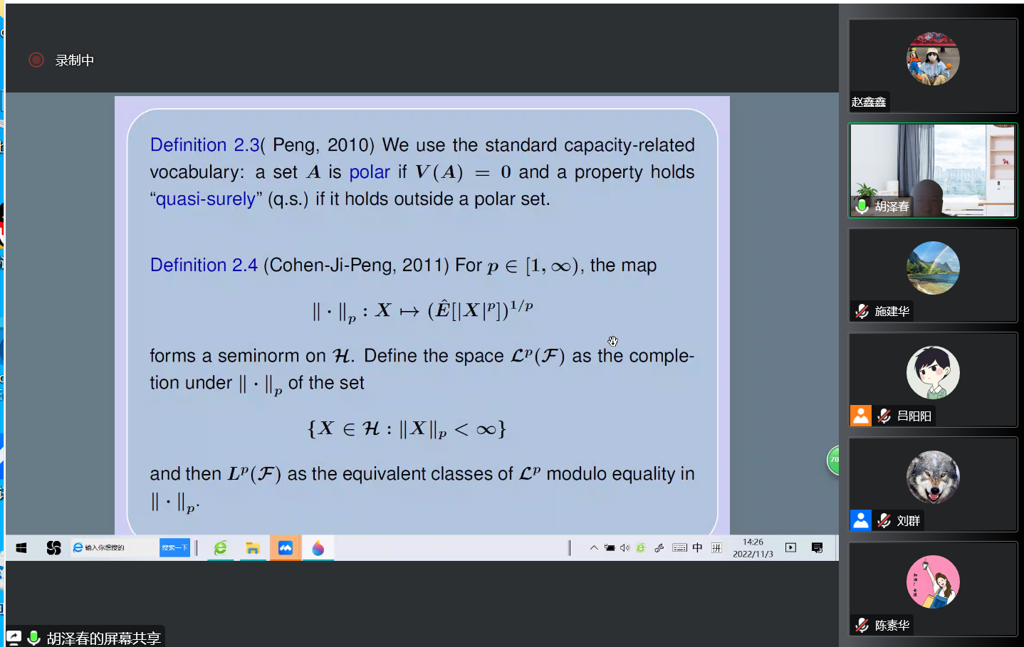 邀请,11月03日下午,四川大学数学学院胡泽春教授在腾讯会议作了题为《概率空间与次线性期望空间中随机变量的收敛性》的报告。相关师生聆听了此次报告,报告由刘群老师主持。